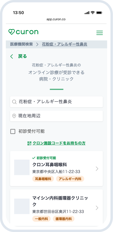 また、一般的には内科、耳鼻咽喉科、アレルギー外来などを扱っているクリニックや病院で治療することが出来、症状によってはオンライン診療が最適な場合もあります。 クロンでは花粉症治療をオンラインで行っているクリニックが多数検索いただけます。症状が出ている場合は我慢をせず一度、医療機関へご相談してみることをおすすめします。